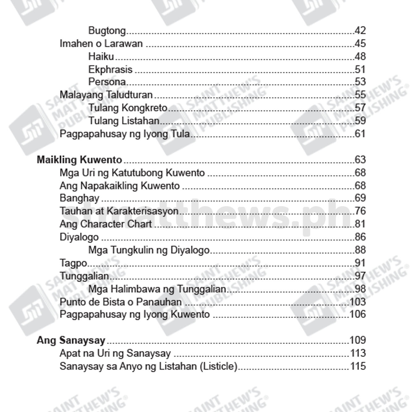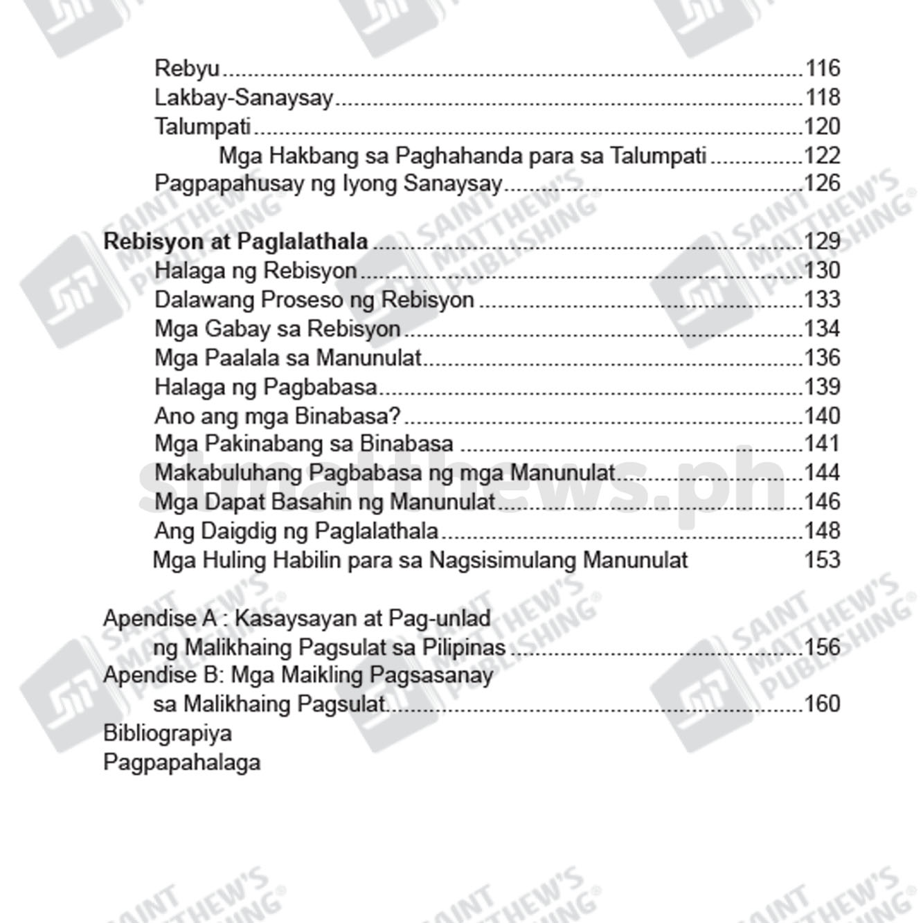 Kaya mong maging mahusay na manunulat na may tiwala sa wika at panitikang Filipino. Gagabayan kang parang kaibigan ng aklat na ito. Matutunghayan sa aklat na ito ang mga nakakaaliw na pagsasanay, mga payo, at mga mungkahing gawain upang maalagaan at mapaunlad ang iyong pagkamalikhain. Makikilala mo ang halaga ng pagbabasa at mga tungkulin sa daigdig ng pagsusulat.