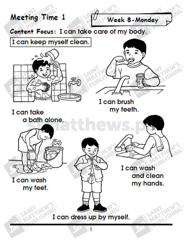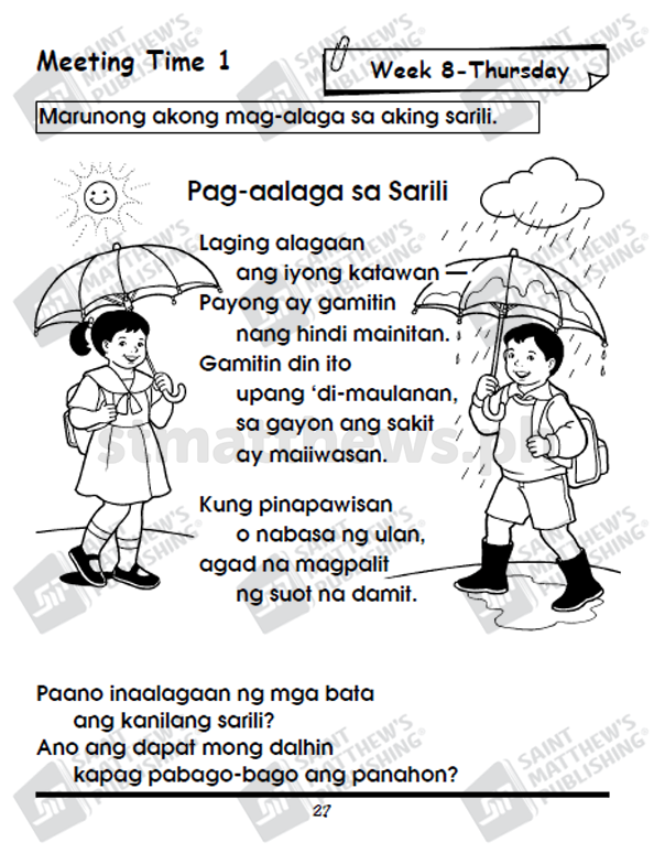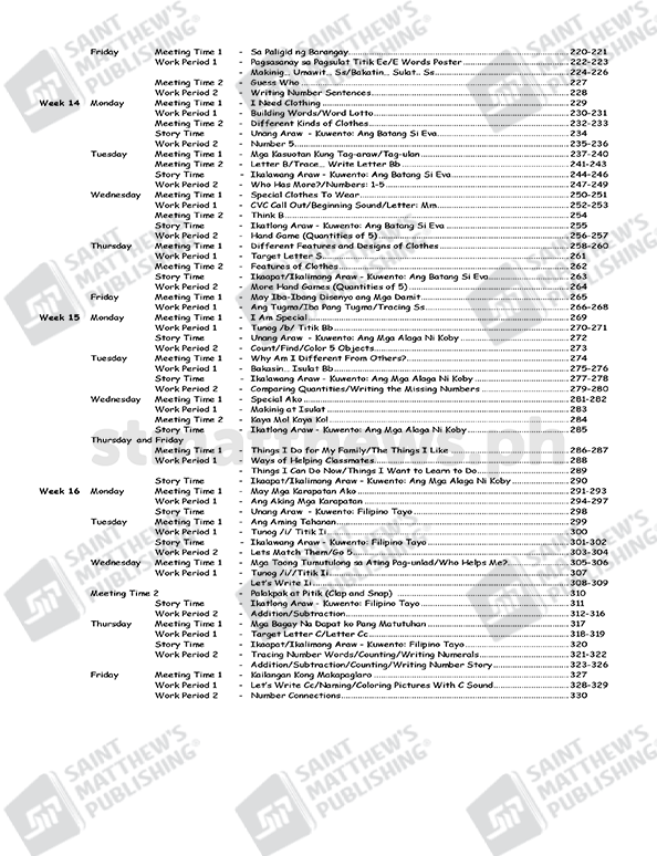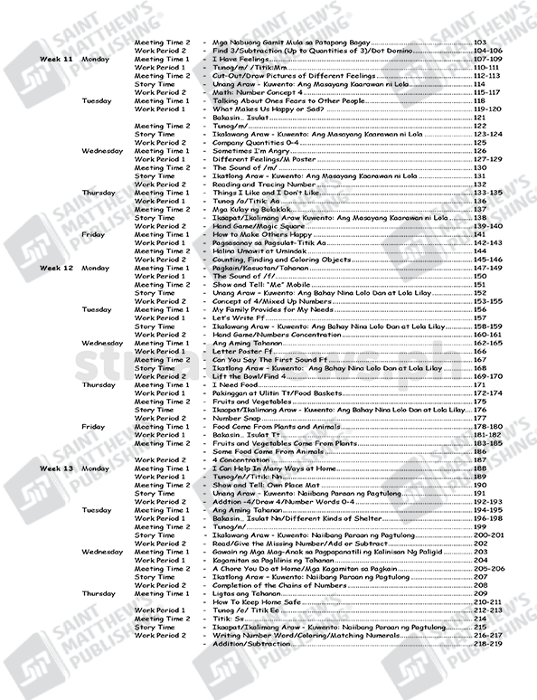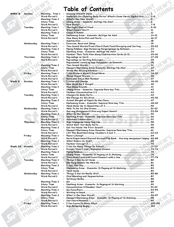 The workbook is based on the National Kindergarten Curriculum Guide and Standards and Competencies for Five-Year-Old Filipino Children (July 2015) prescribed by the Department of Education. It is anchored on the principles of child development and on the different learning theories: cognitive, social learning, and socio-cultural and ecological system. Learning experiences are in the form of stories, songs, poems and games. Short stories that involve fantasy and current issues that are within the child’s world are provided with comprehension questions that truly develop the child’s critical thinking and analytical skills. Play is an integral part of the children’s learning experiences in this Worktext cum Lesson Plan.