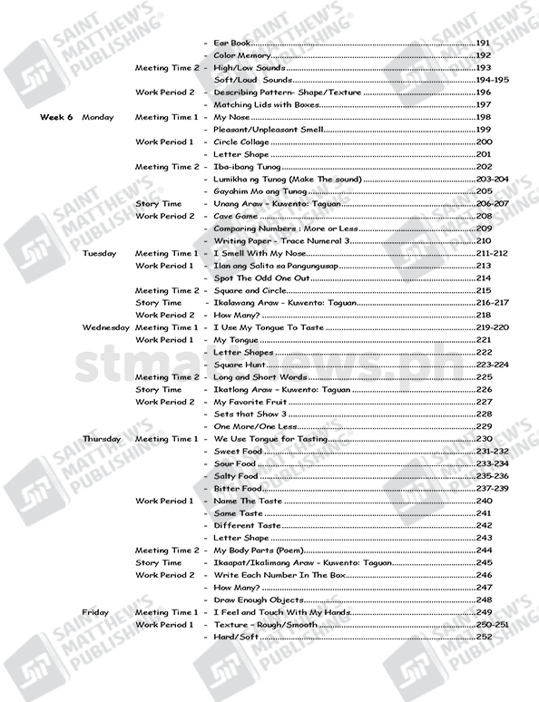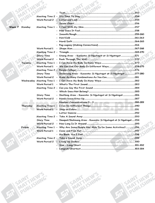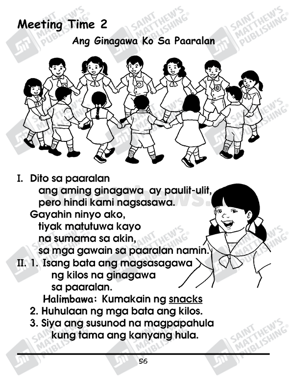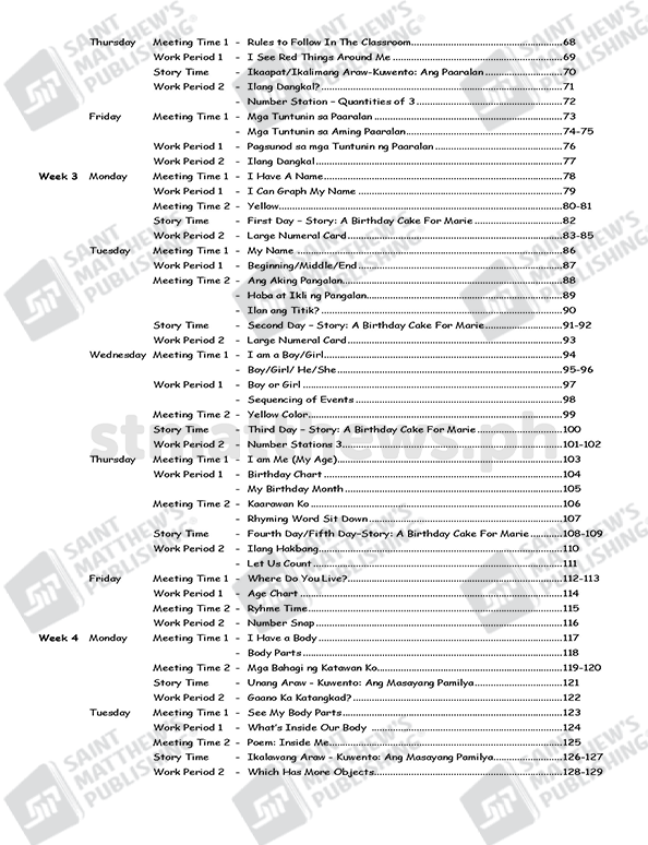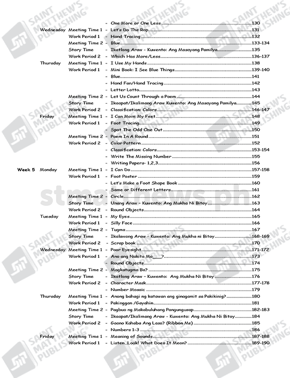 The workbook is based on the National Kindergarten Curriculum Guide and Standards and Competencies for Five-Year-Old Filipino Children (July 2015) prescribed by the Department of Education. It is anchored on the principles of child development and on the different learning theories: cognitive, social learning, and socio-cultural and ecological system. Learning experiences are in the form of stories, songs, poems and games. Short stories that involve fantasy and current issues that are within the child’s world are provided with comprehension questions that truly develop the child’s critical thinking and analytical skills. Play is an integral part of the children’s learning experiences in this Worktext cum Lesson Plan.