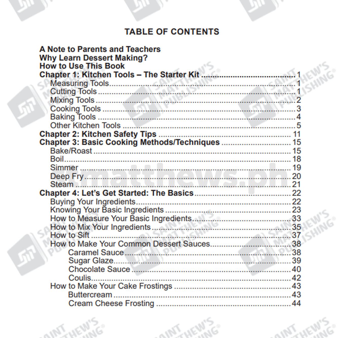 DESSERT 101: For kids and kids-at-heart is for children and novice cooks who wish to learn the wonderful art of dessert making. With easy-to-follow instructions and a bunch of delightful recipes, it aims to introduce not only the fundamentals of cooking and baking, but also the values of discipline, responsibility, and joy in creation. We hope that the readers, both kids and kids-at-heart, find adventure and a plate-full of happiness in each sweet treat.