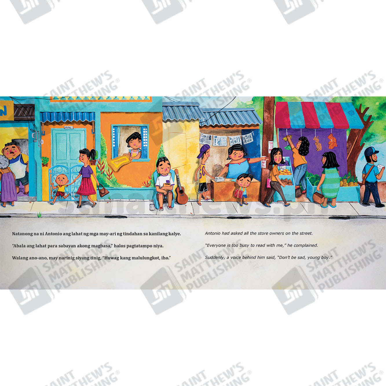 Antonio can already read by himself, but he wants to read to someone so they can appreciate how well he can read. But everyone is too busy with their jobs to read with him. Suddenly, a voice calls out to Antonio. Who can it be who at last wants Antonio to read a story to him? This heartwarming picture book teaches about the joy of reading, professions, disabilities, and friendship.